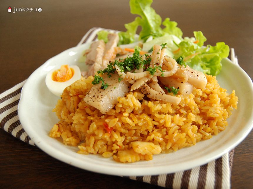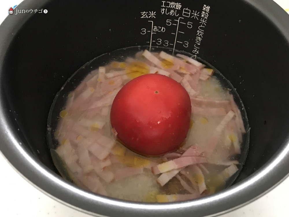炊飯器に2合のお米を入れ、2合の目盛りより少なめに水を注ぎ。ヘタをとったトマト、ベーコン、シーフードミックス、コンソメキューブ2個、カレー粉(小1)を加えて炊く。炊き上がったらトマトの皮を取り除き、全体を混ぜ10分程蒸らす。塩・こしょうで味を調えてお好みでパセリをふる。