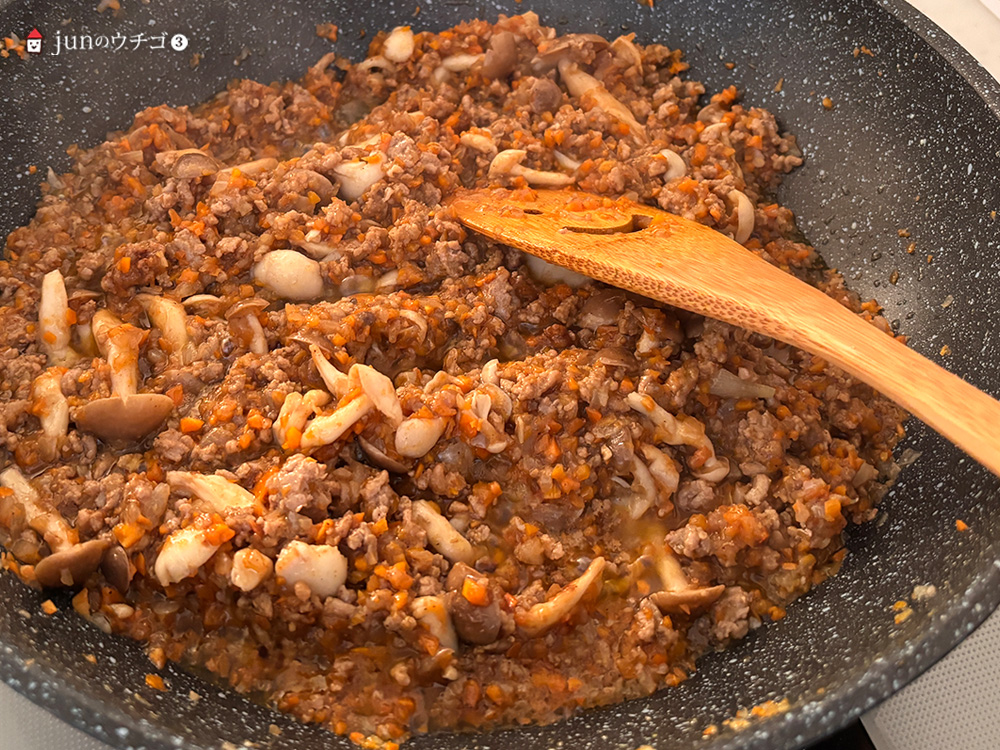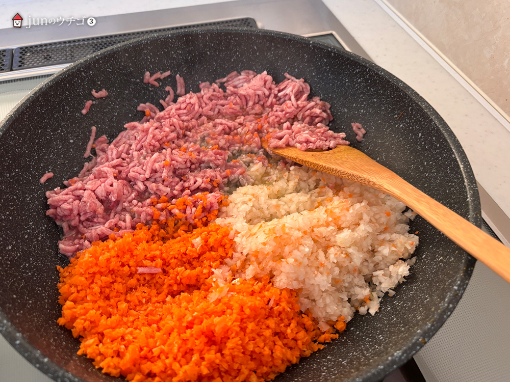 ◎フライパンに油とにんにくを入れて弱火にかけ、香りが立ったらひき肉、玉ねぎ、にんじんを加えて中火でしんなりするまで炒めます。肉から出た余分な脂は、キッチンペーパーなどで軽く吸い取る。