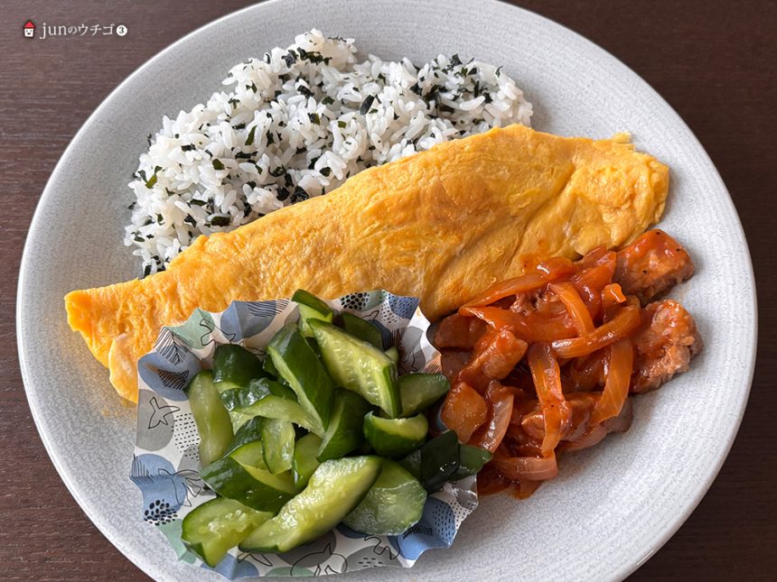 私にとってはコレごちそうで。ワカメごはん。白出しと塩とちょこっとのオリゴ糖の卵焼き。軽く塩したキュウリ。
