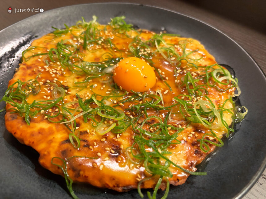 6、つくねの上にタレをかけ、卵黄、ねぎ、ごまを散らして完成。