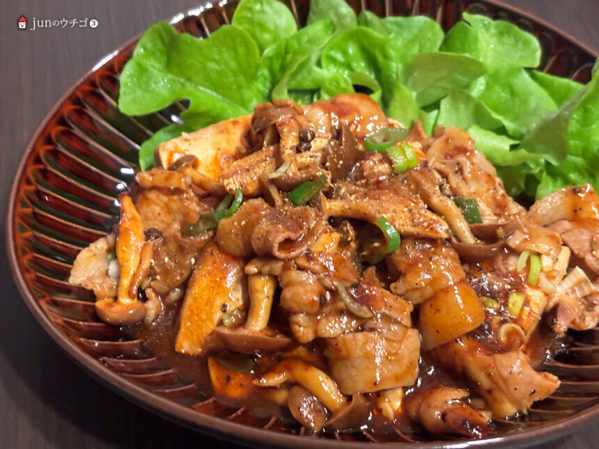 5、タレがフツフツとしてとろみがつき、全体に馴染んだら出来上がり!お皿にレタスを敷いて盛り付け、仕上げに黒こしょうを振る。